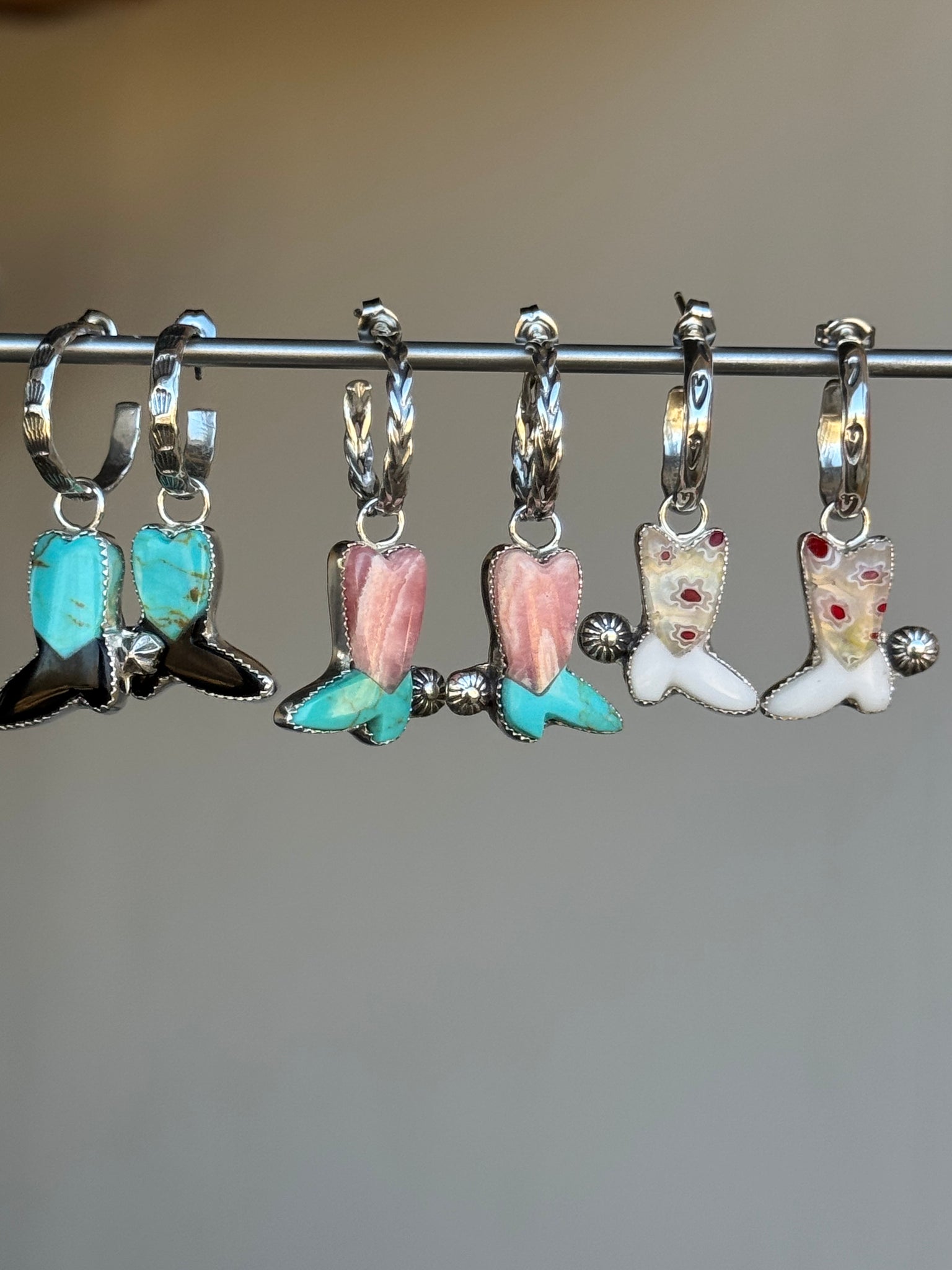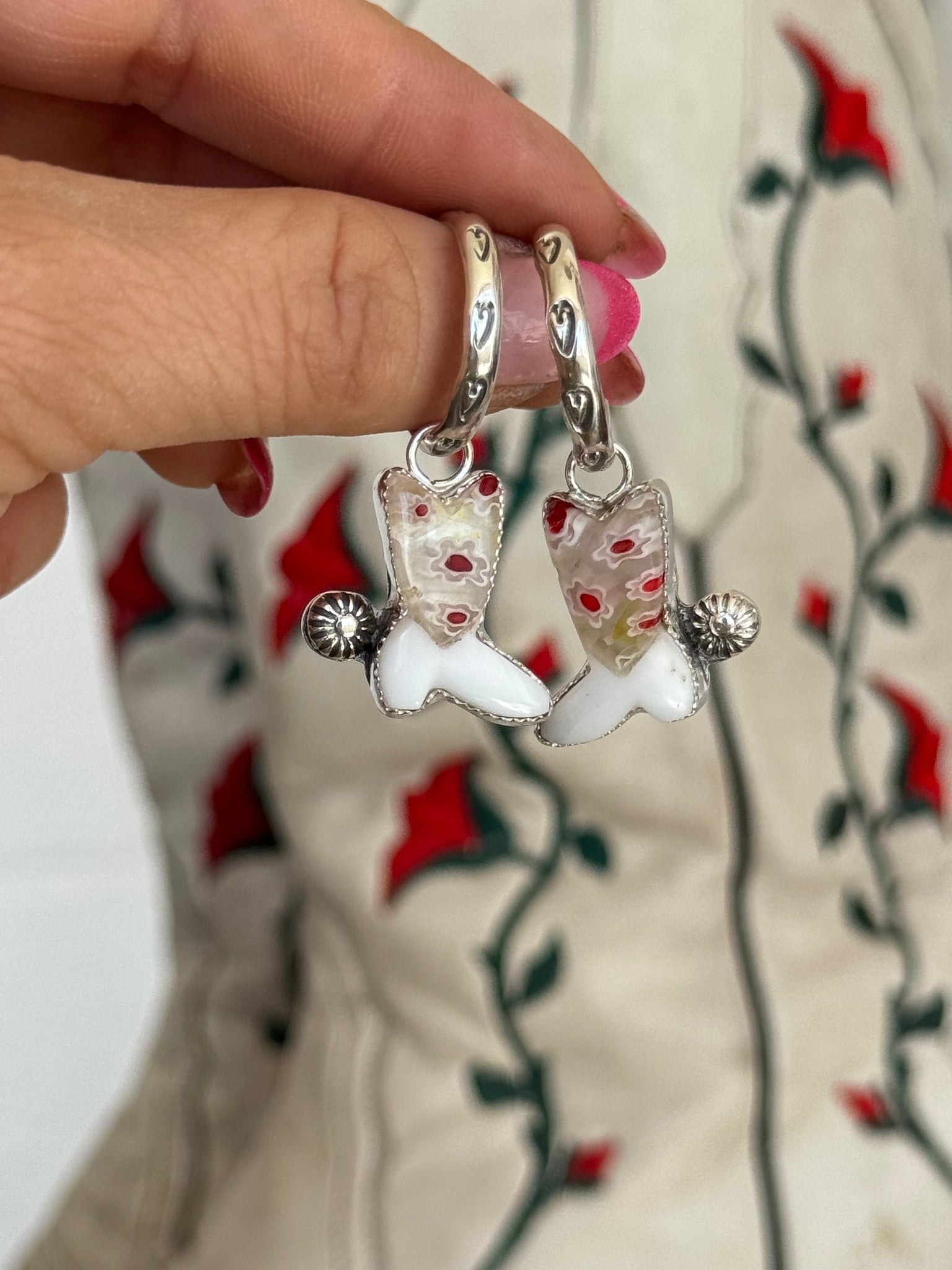 Handcrafted and constructed from sterling silver metalsMilliefori Slag and white agate stone cowboy boots, all hand cut and cabbed