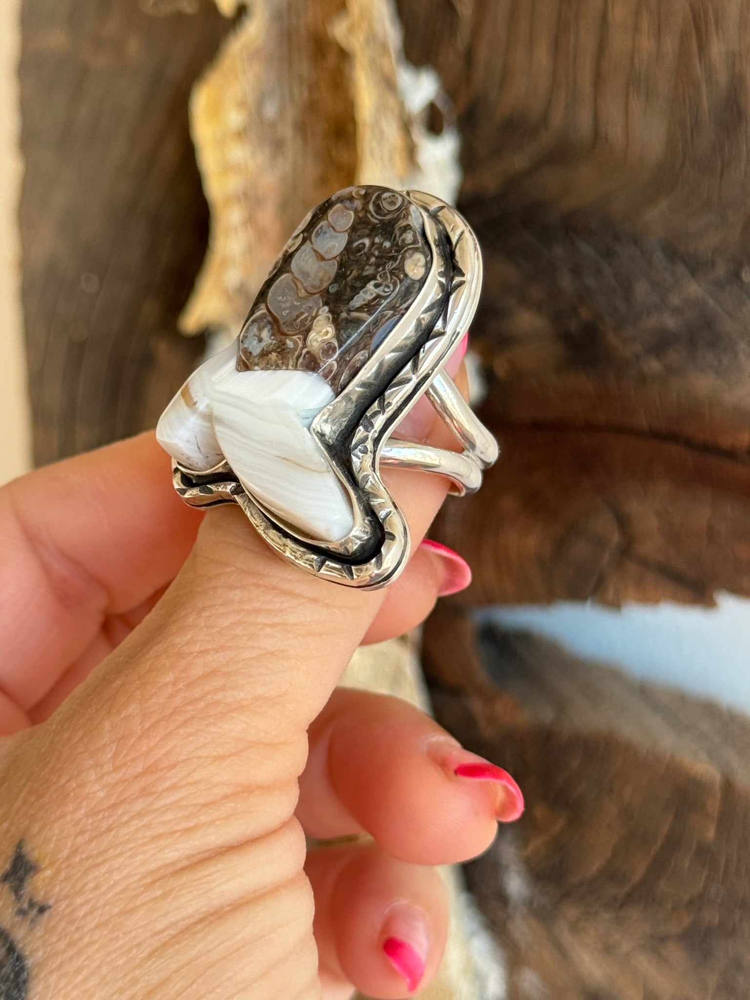 Handcrafted and constructed from sterling and fine silver metals. This one of a kind Fossil Rattlesnake and Agate ring was all hand cut and shaped into a custom boot. Handcrafted snake finishing.