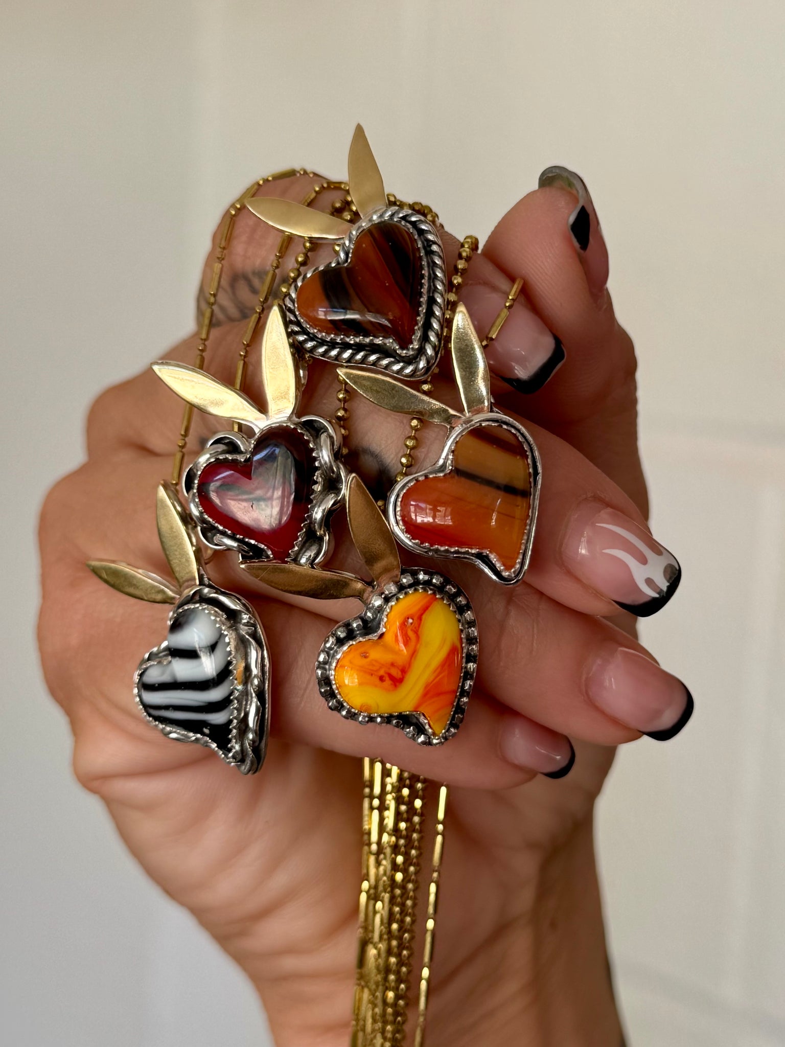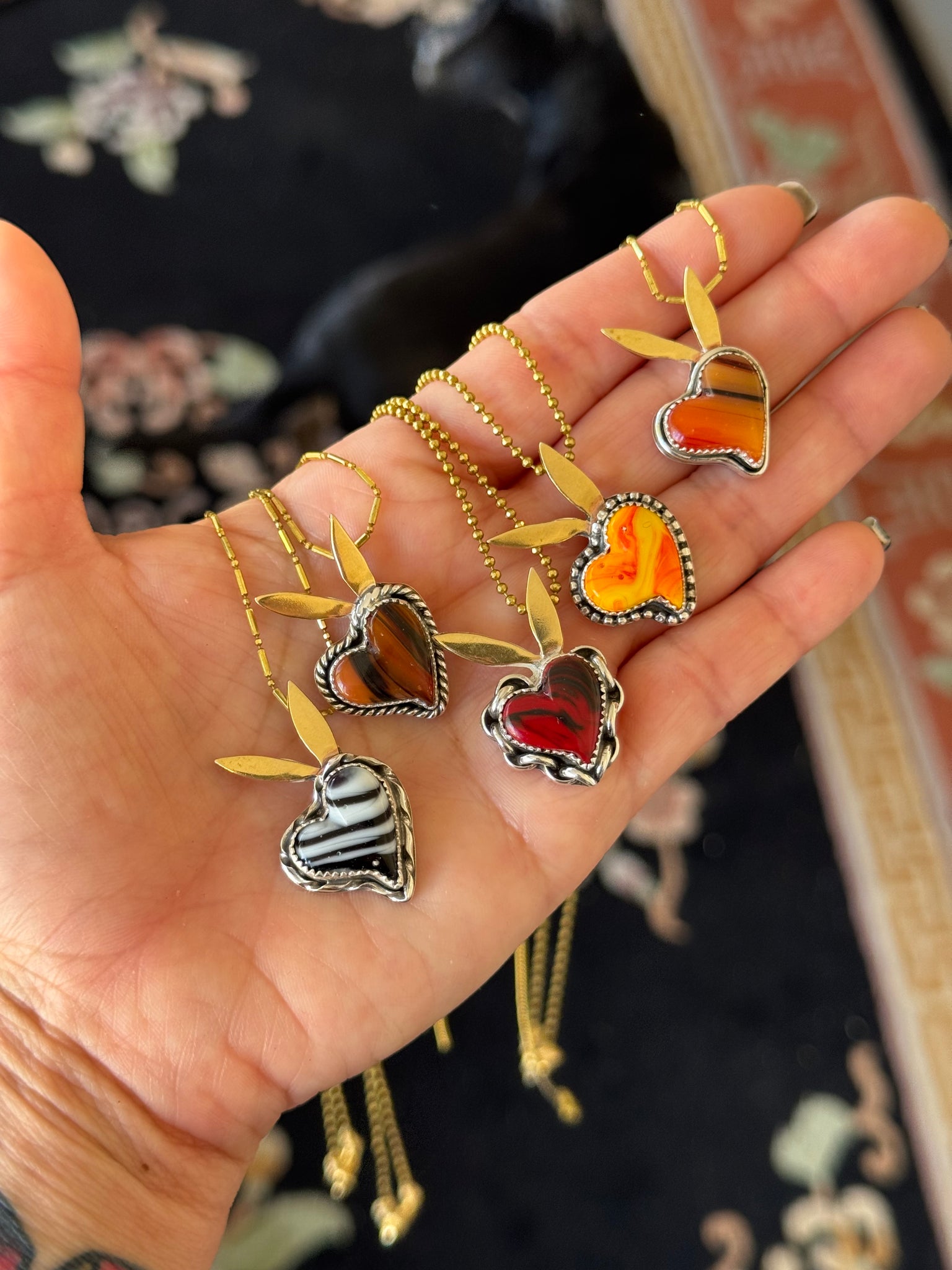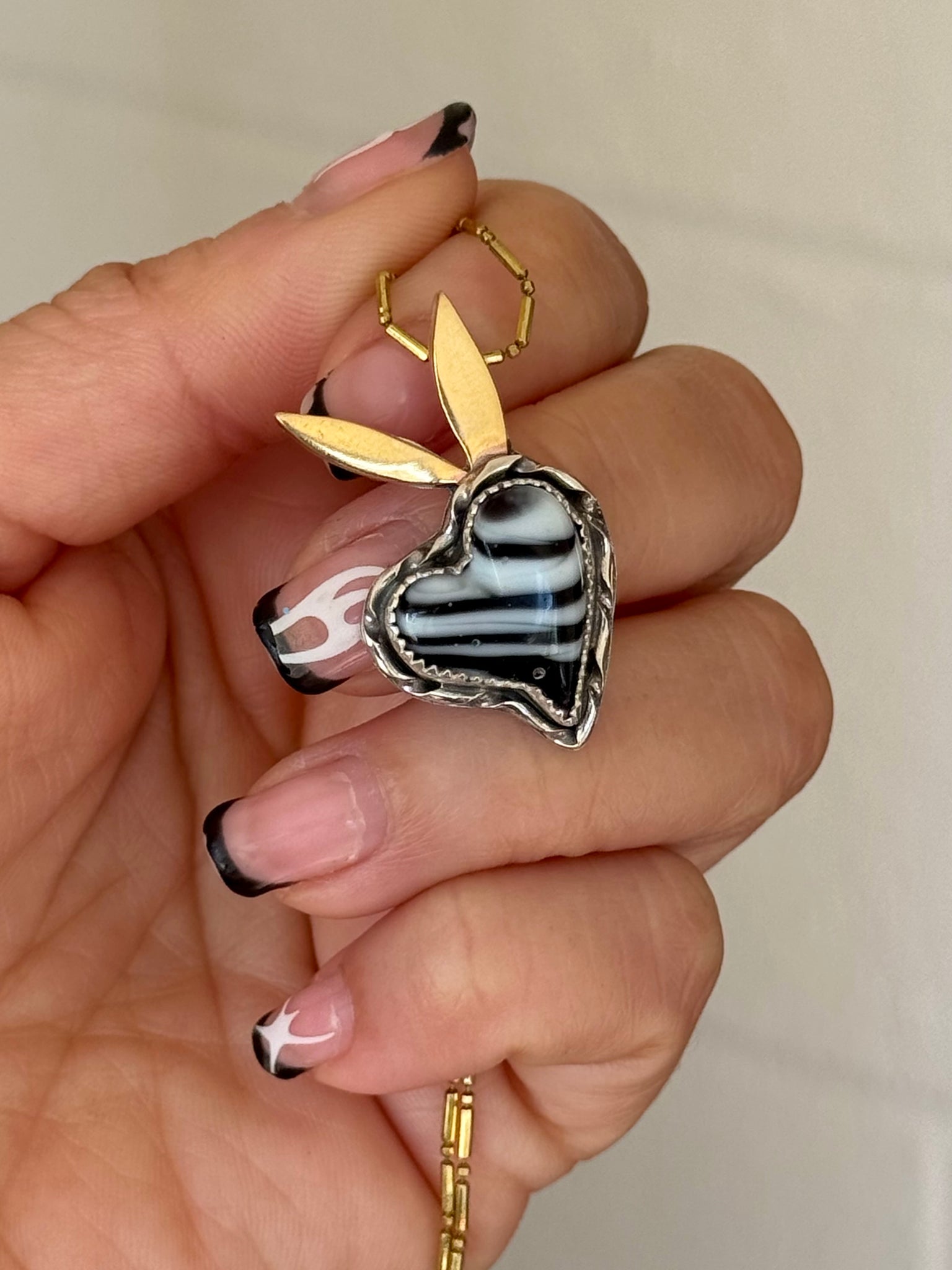 Hand cut, shaped and polished 1950s Akro Marble black and white swirl heart
