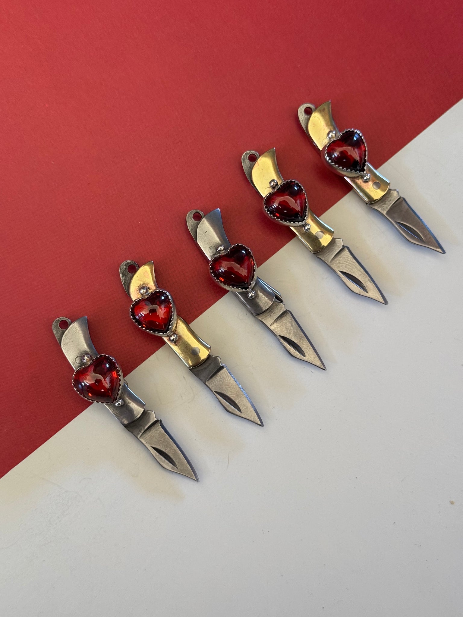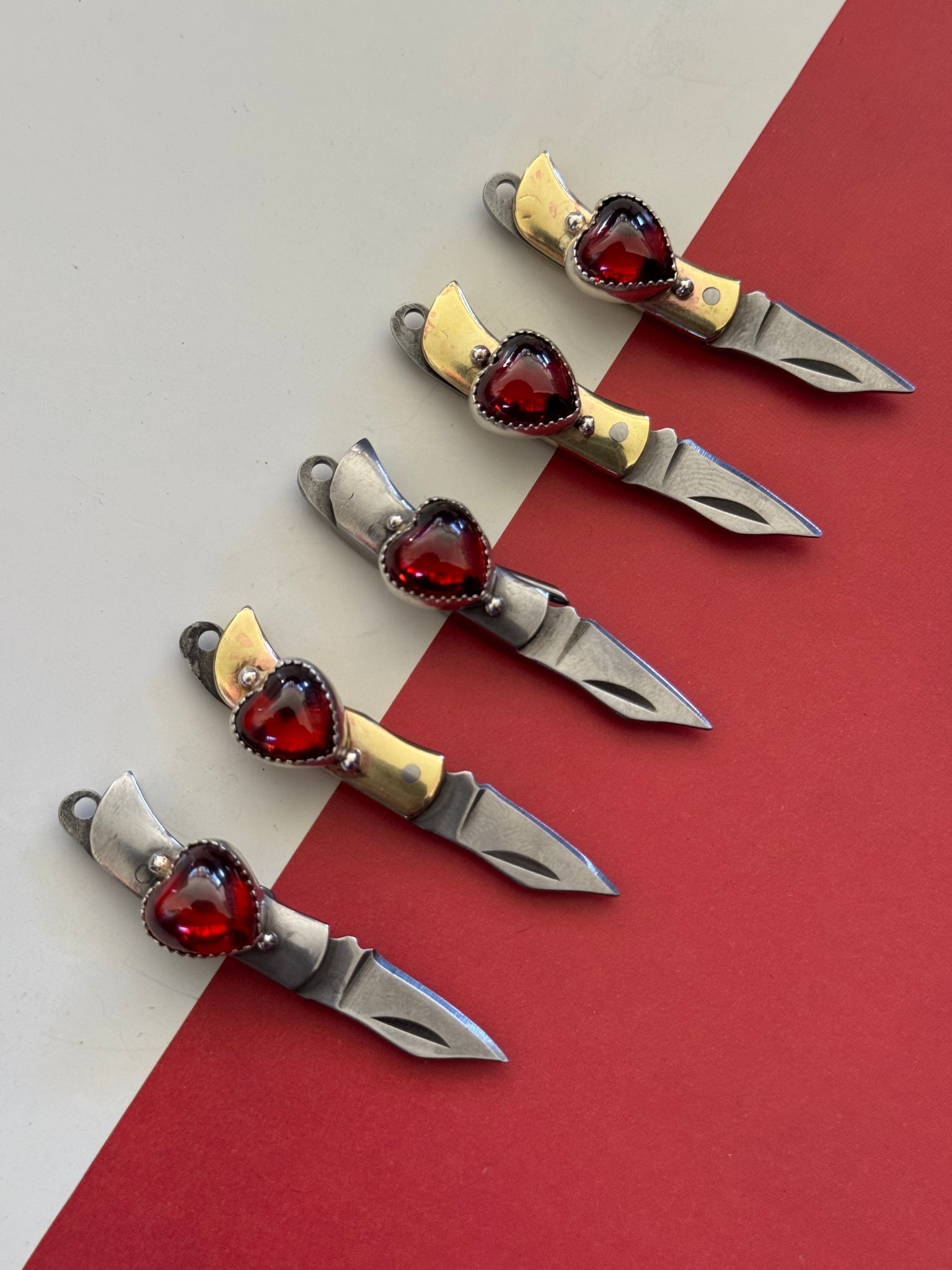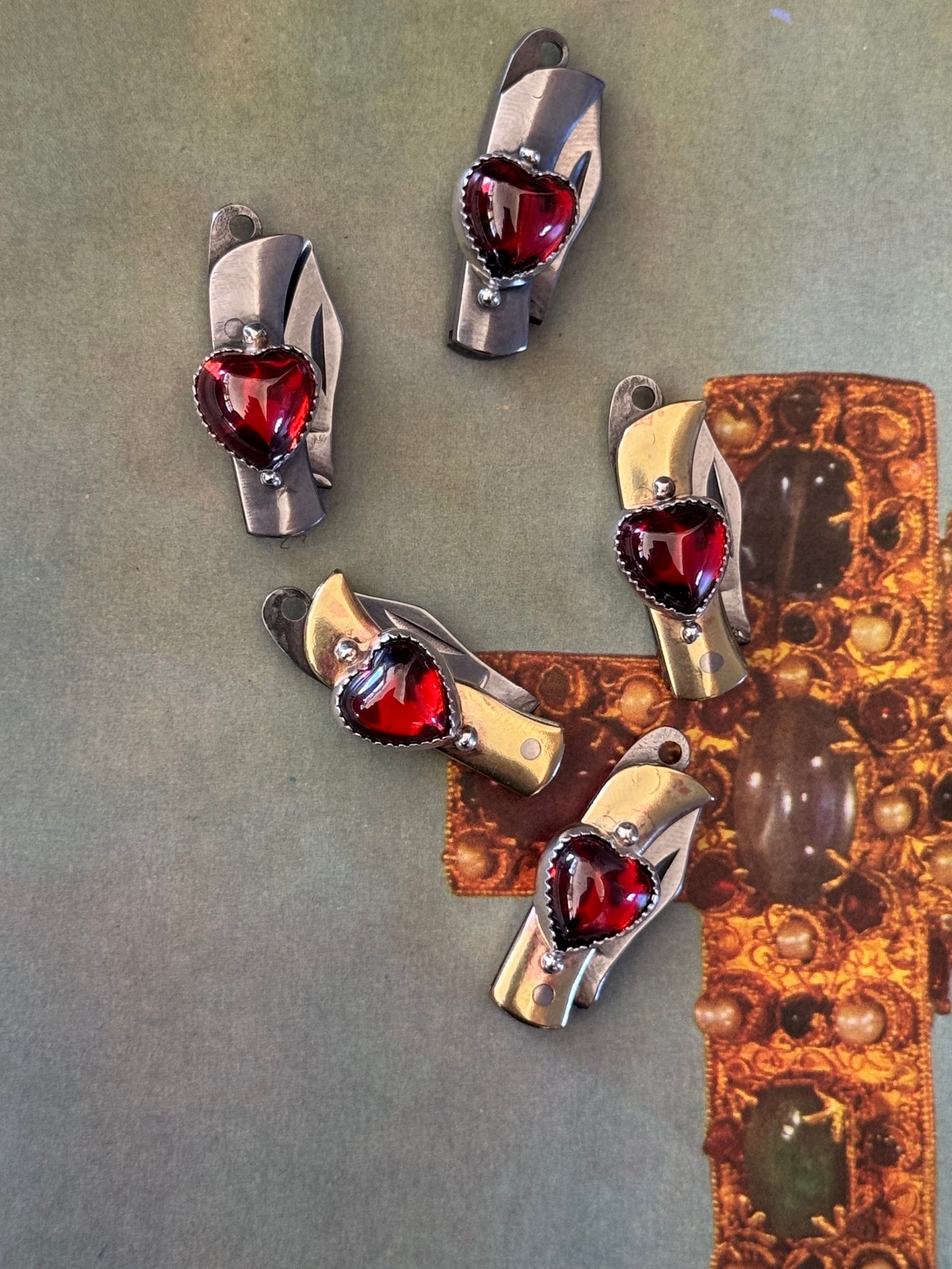 up cycled from vintage mini pocket swivel knives. Vintage red glass hearts, all set in Sterling and fine. silver metals