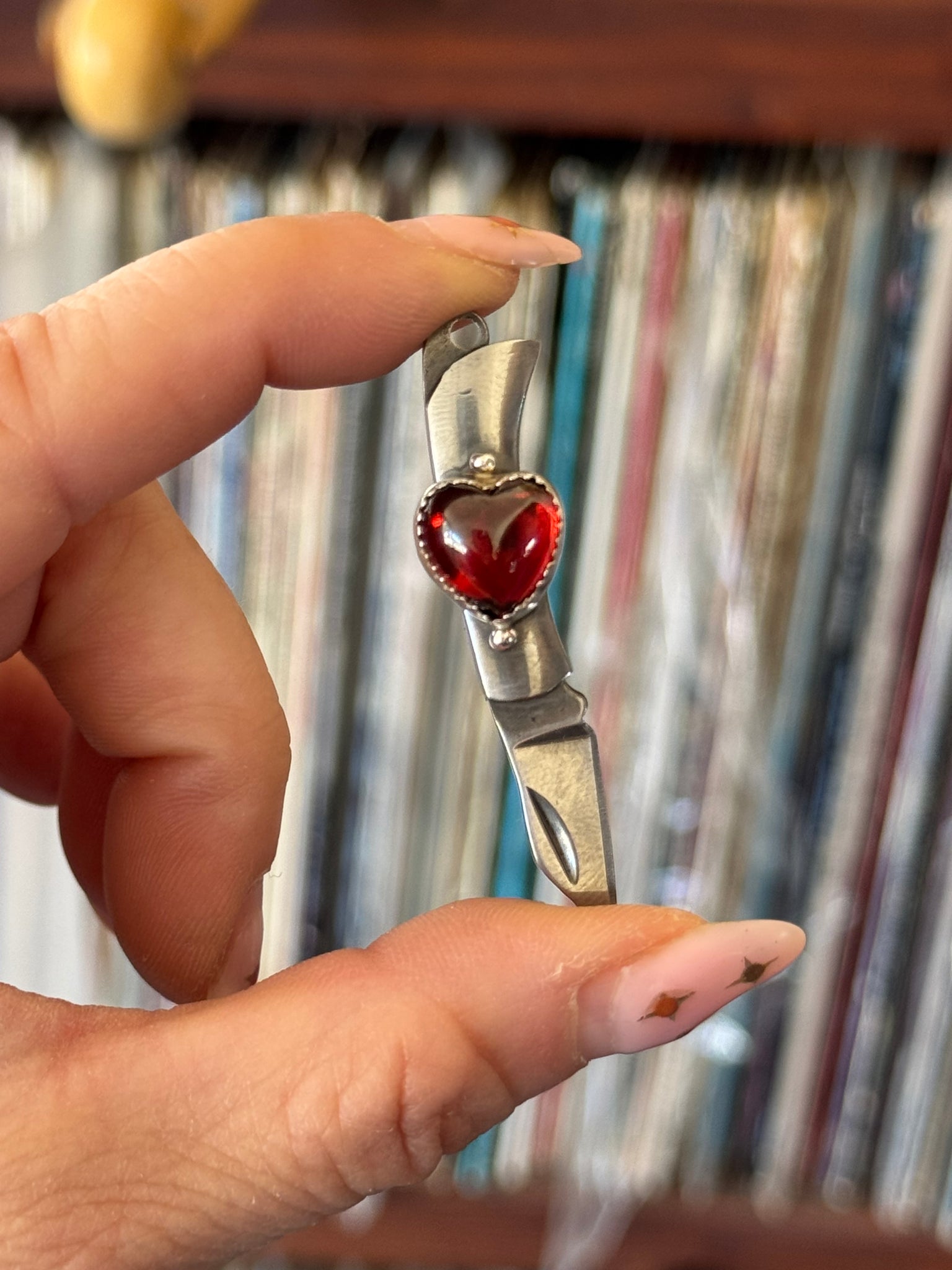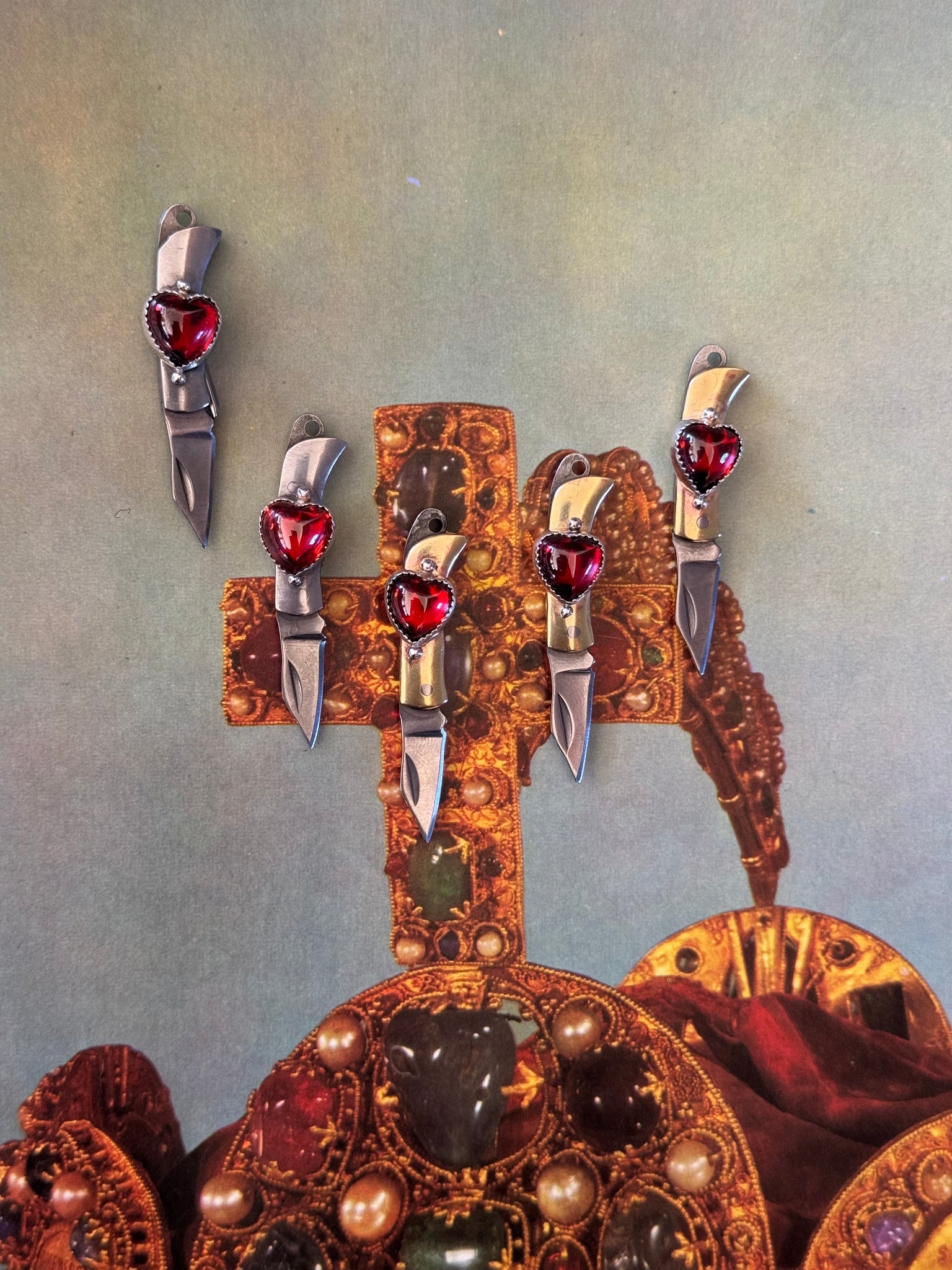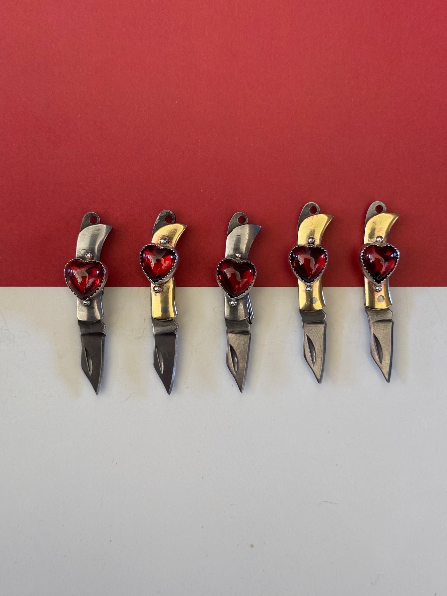 up cycled from vintage mini pocket swivel knives. Vintage red glass hearts, all set in Sterling and fine. silver metals