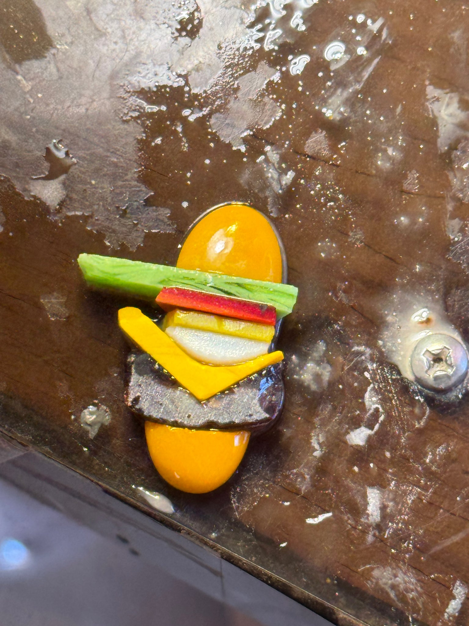 Handcrafted and constructed from Sterling silver metals. These one of a kind cheeseburger rings are all hand assembled using vintage slag glass.